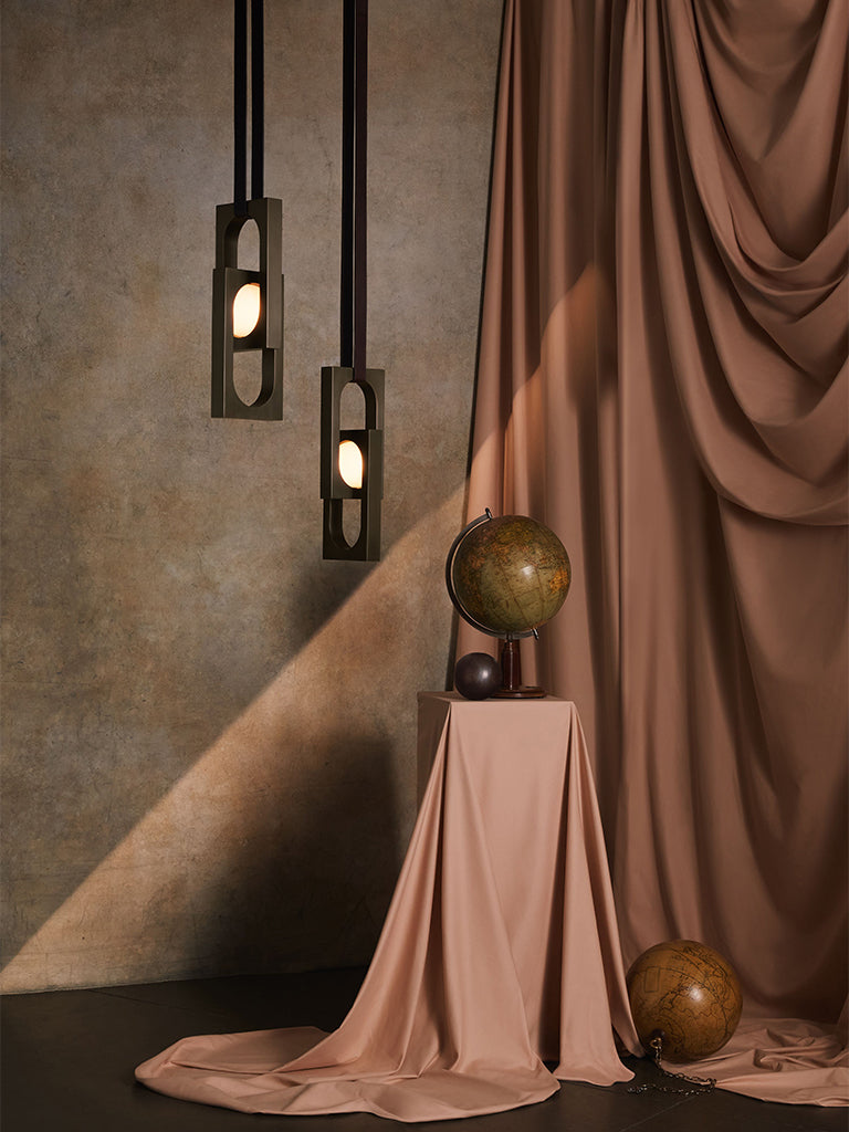 Mythos is a brass pendant light formed of one or two sculptural interconnected links capturing an illuminated glass orb. Mythos is a single pendant suspended by a cord. Mythos Duo is available suspended from a hand-stitched leather strap which acts as a sling for the links, concealed connections make it almost impossible to determine how the orb generates its illumination.