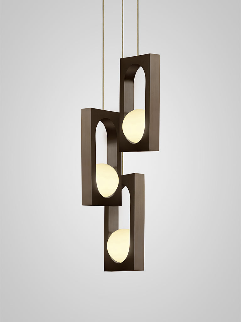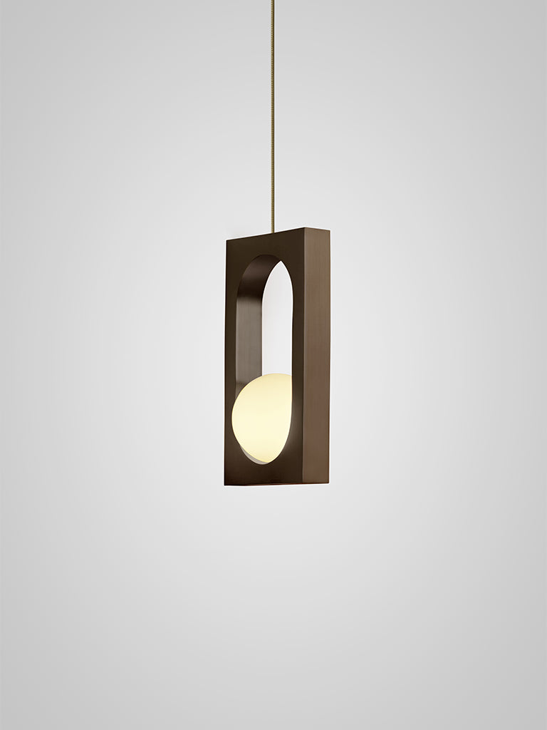 Mythos is a brass pendant light formed of one or two sculptural interconnected links capturing an illuminated glass orb. Mythos is also available as a single pendant suspended by a cord.