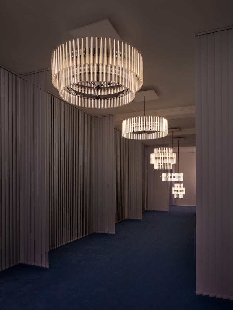 A chandelier of multiple adaptations which projects layers of ethereal rings of light created from linear LED light bulbs. Created and produced by Lee Broom, the hand blown glass bulbs contain a perpendicular LED filament which refracts against the vertical lines of the reeded glass. En masse and reflecting in the rings, the overall effect ensues a glowing aura.