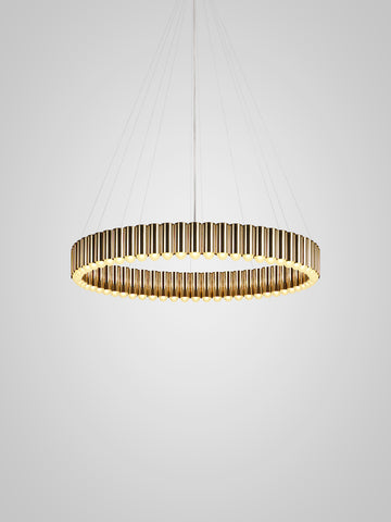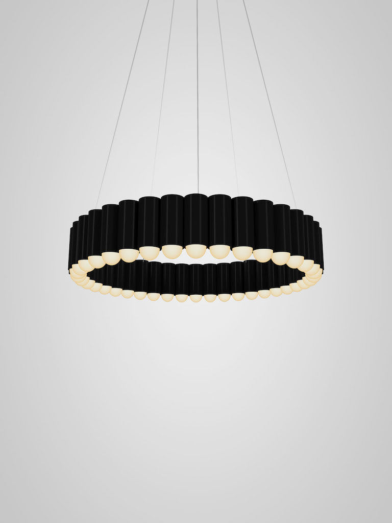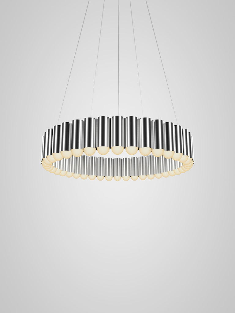 Inspired by the merry-go-round ride of a traditional British fairground, Carousel is a pendant light with a heavyweight presence that floats gently in space. Cylinders of gold, chrome, gunmetal or black each house an inset LED lighting element resulting in a spectacular yet playful ring of light. Carousel is available in 4 sizes, Small, Medium, Large and XL each suspended from a matching finish circular ceiling plate by steel suspension wires with a single clear cable.