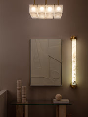 Inspired by the pressed glass bricks often used as an alternative to stained glass in places of worship during the 1970s, Chant is formed of blown glass cubes with a pronounced circular detail in either clear or frosted glass. Constructed in square configurations, the glass cubes connect to form glowing brick-like chandeliers in single or two tiers.