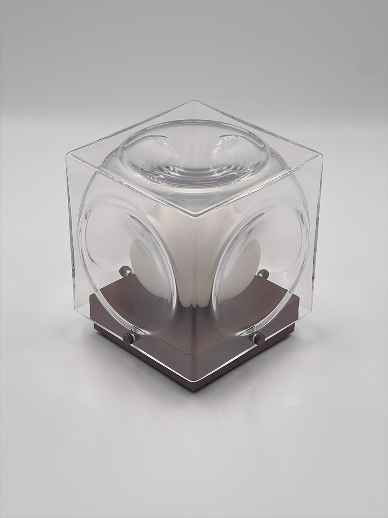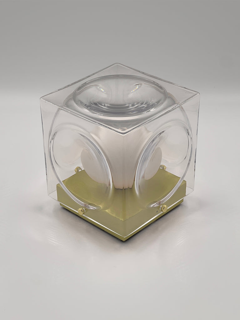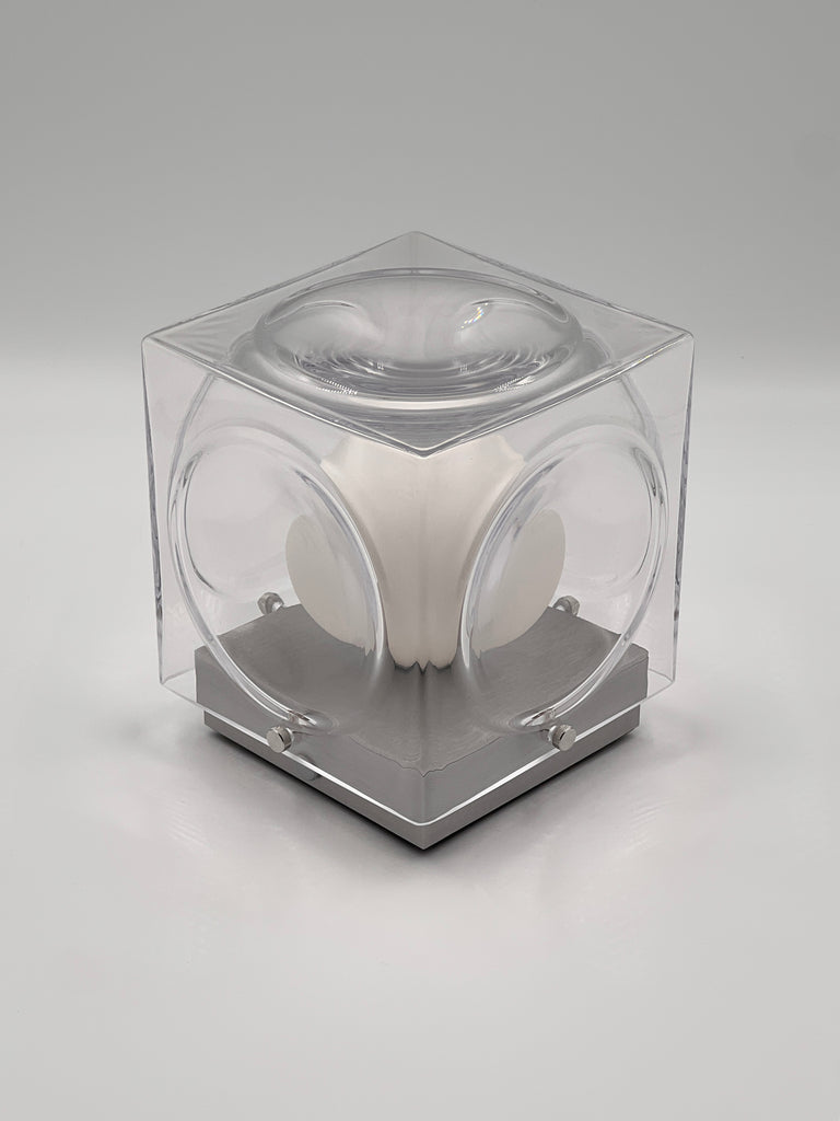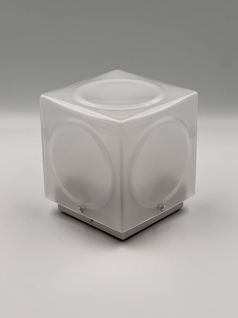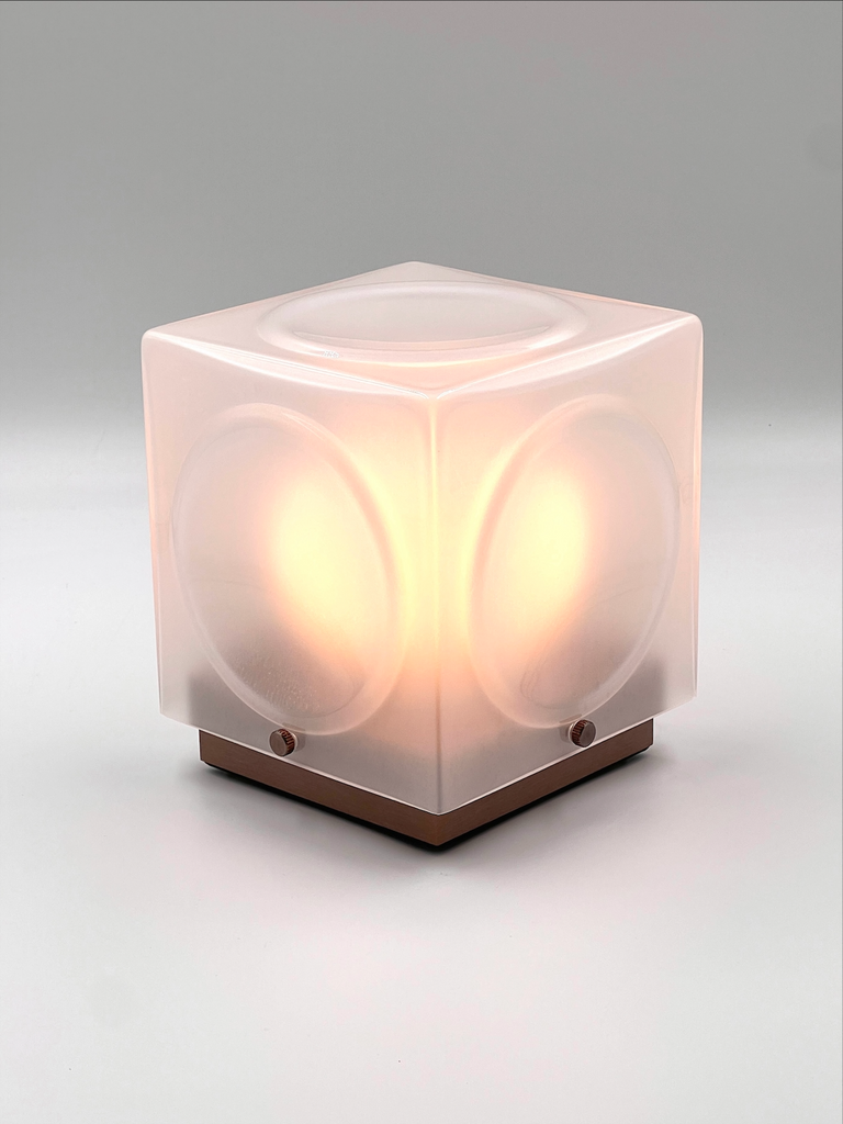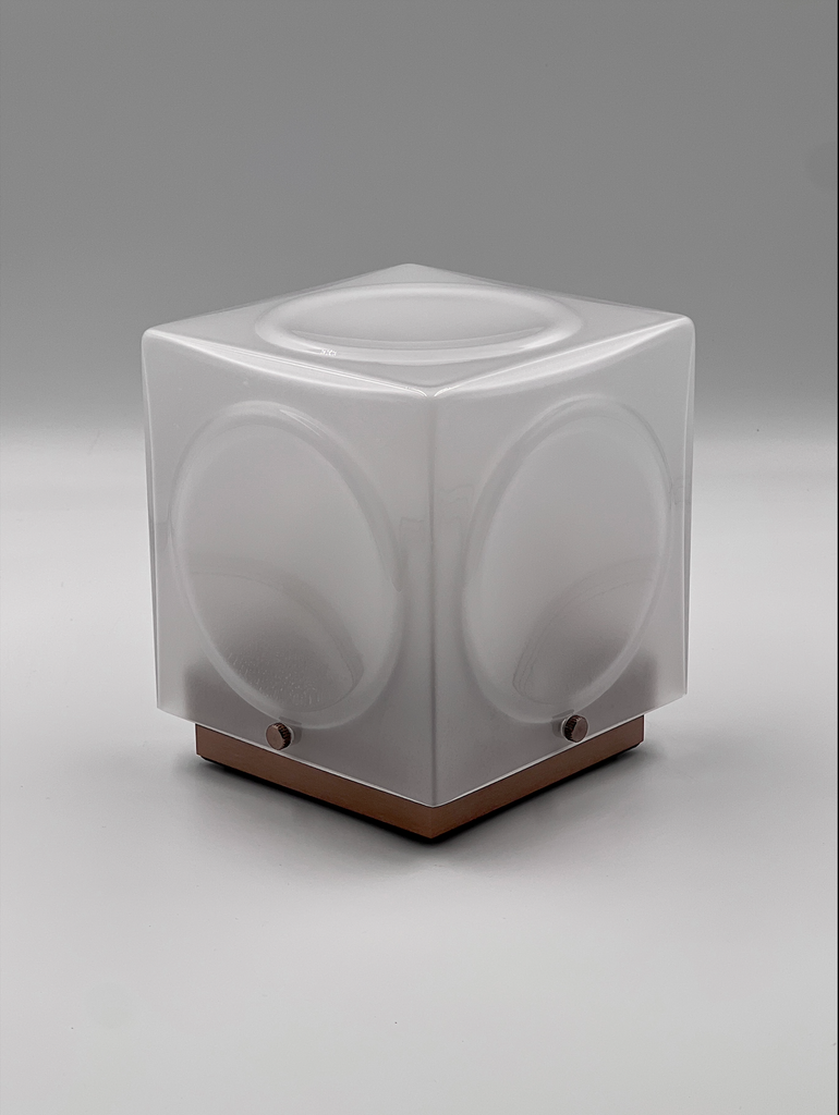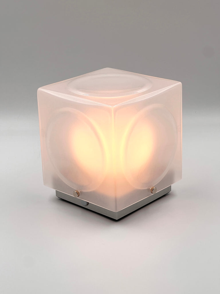 The Chant Portable Table Lamp is a sculptural glass object that elegantly balances form and function, drawing inspiration from the architectural glass blocks of the 1970s. Hand-blown in glass, the lamp features a bold square profile softened by an indented circular motif on each side, offering a refined nod to both nostalgic and modernism.