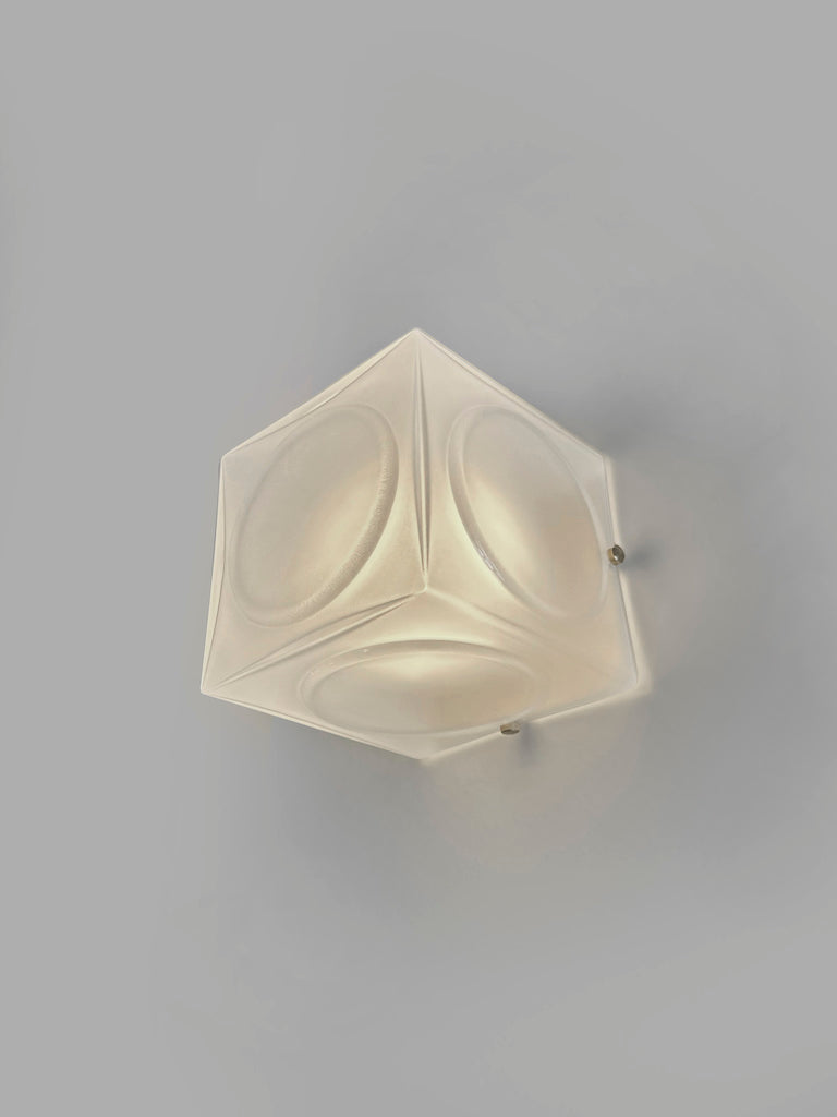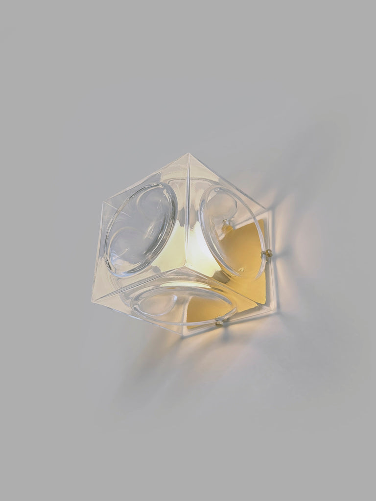 Inspired by the pressed glass bricks often used as an alternative to stained glass in places of worship during the 1970s, Chant is formed of blown glass cubes with a pronounced circular detail in either clear or frosted glass. The Chant Surface Light features a single glass cube mounted to a brushed gold or silver flush mount.