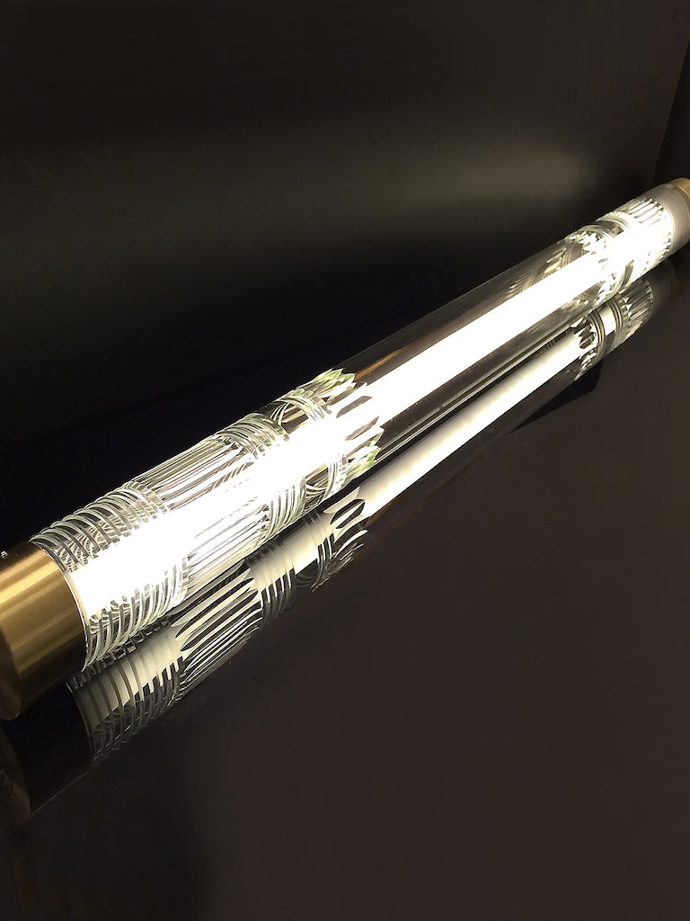 Composed of a decoratively patterned length of hand-cut lead crystal which is capped at each end, Crystal Tube contains a slender LED light source resulting in a sparkling beam of light. A luxurious reimagining of the standard fluorescent tube light, Crystal Tube is suspended from both ends by a thin tensile wire allowing it to be hung horizontally or at an angle.
