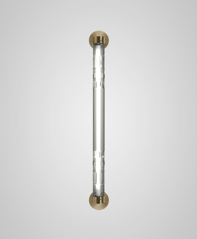 Composed of a decoratively patterned length of hand-cut lead crystal which is capped at each end, Crystal Tube contains a slender LED light source resulting in a sparkling beam of light. A luxurious reimagining of the standard fluorescent tube light, Crystal Tube Wall Sconce has either Brushed Brass or Polished Chrome end sections.