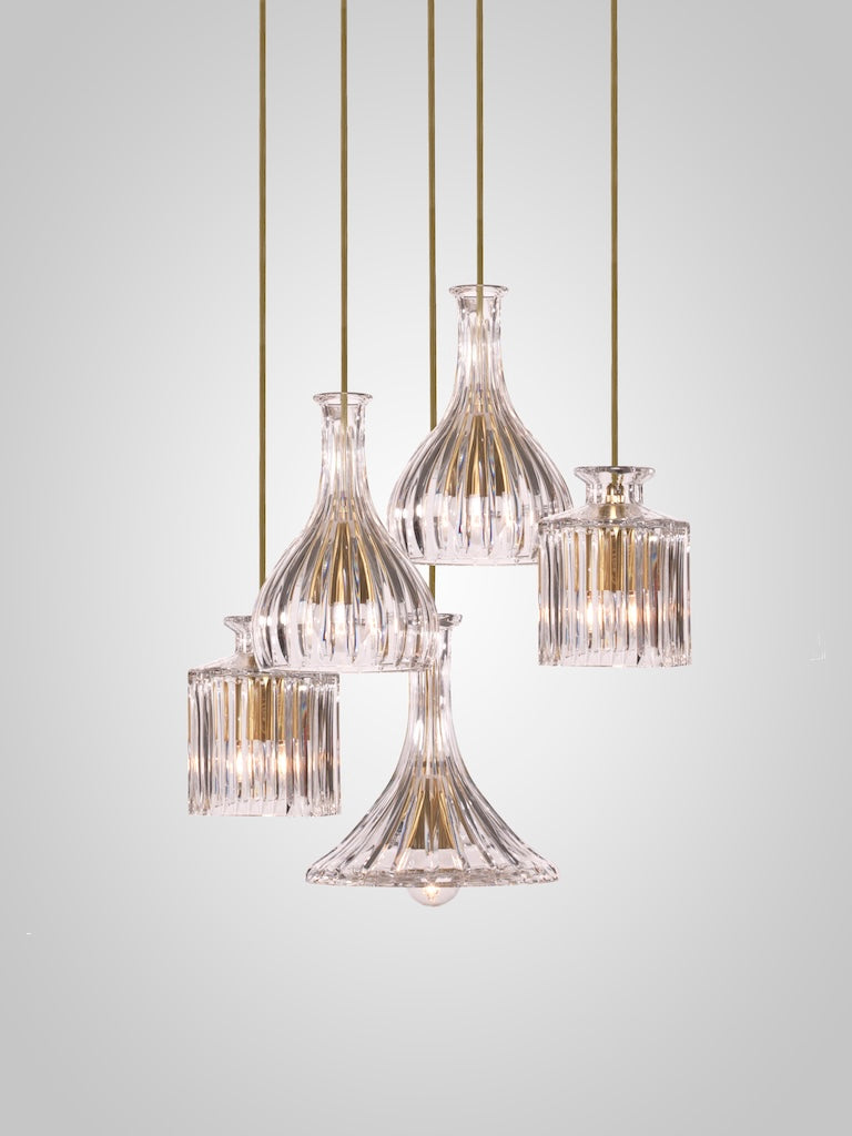 This Decanterlight Chandelier is a stunning lighting centrepiece featuring two Square, two Bell and one Tulip Decanterlight hung at various lengths to create a luxurious installation of clear, hand cut, crystal shades.