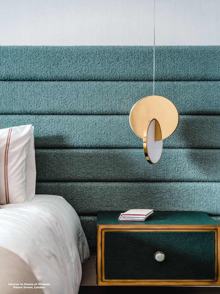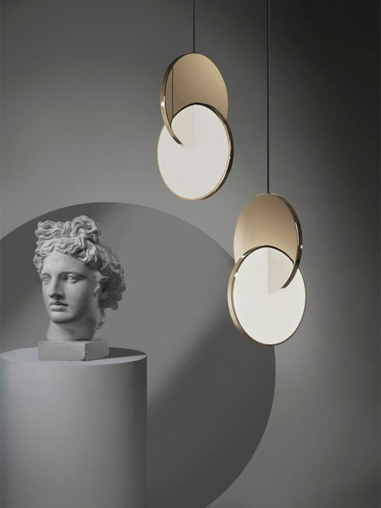 Eclipse Pendant is celestial in both its name and inspiration. Mirror-polished gold and acrylic discs interact, dissect and obscure, which both eclipses and reveals its illumination to the viewer at the same time. Eclipse has been produced as a singular pendant light, tiered chandelier and table lamp.