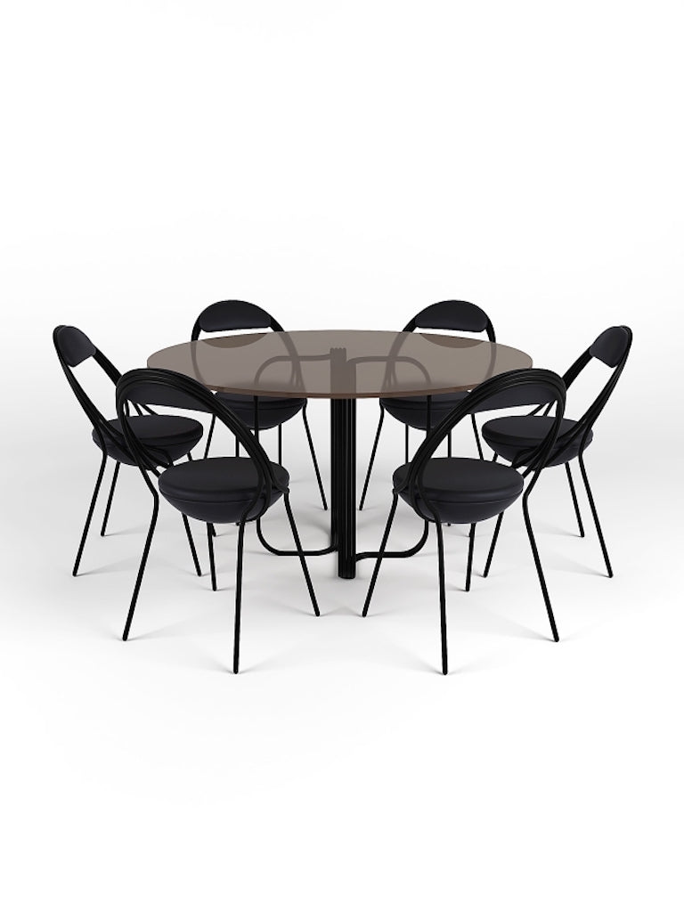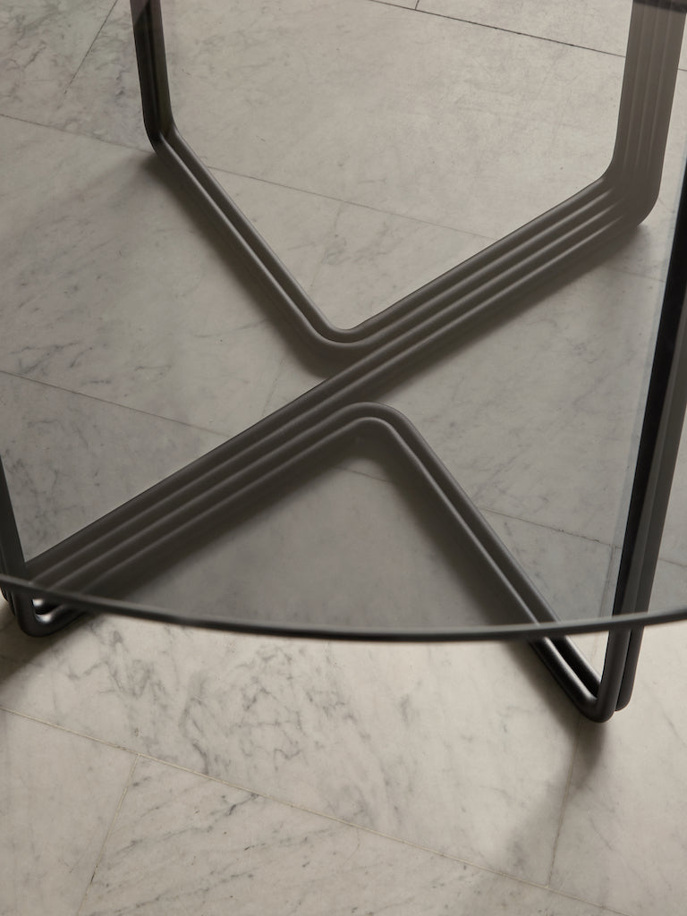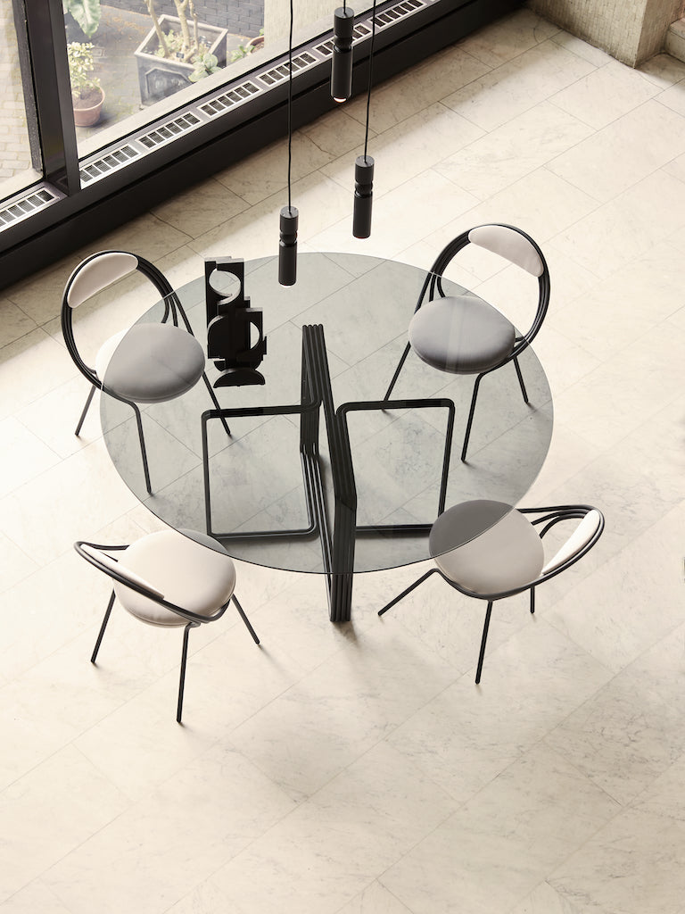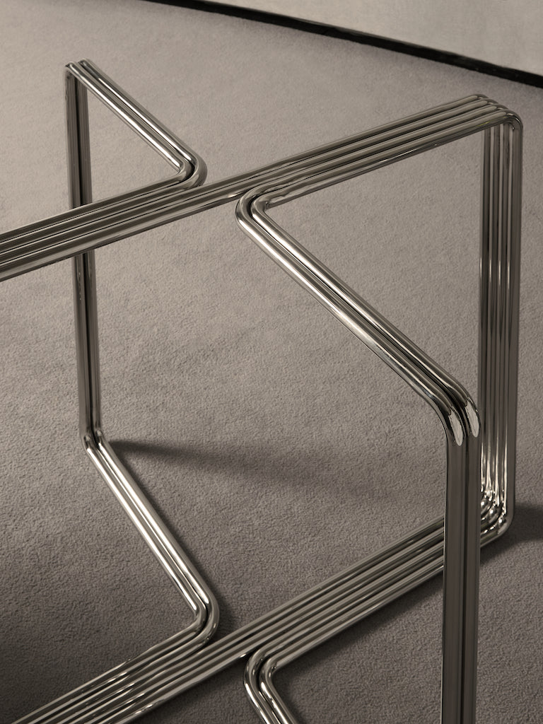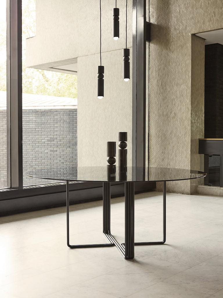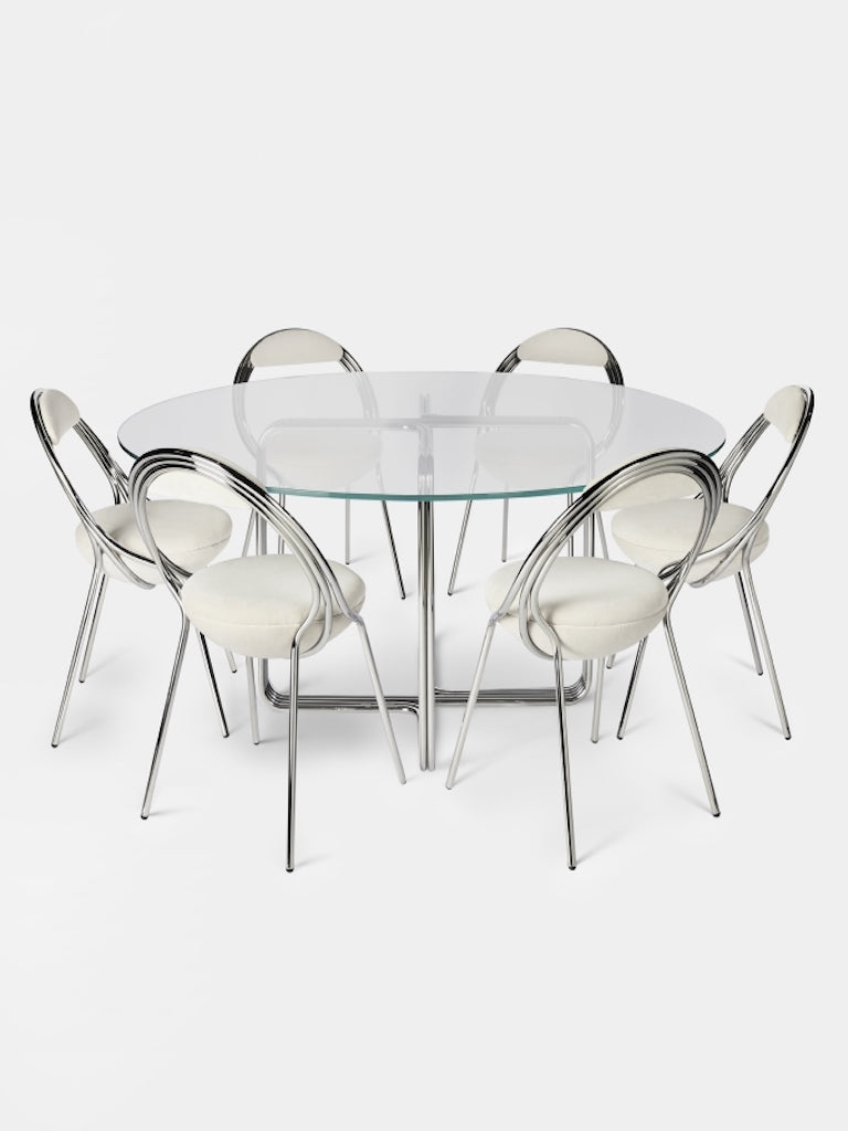 The circular Musico dining table takes its cues from the Musico chair design, with a base formed from the same linear tubes. The Musico collection inspired by Lee Broom’s long-held passion for mid-century design and, perhaps more significantly, his great love of classical music, which plays an integral part in his design process. Reminiscent of the coils and wraps of musical instruments, its contours have been created by three continuous hand-bent, hand-polished and plated tubes, which form a seamless pedestal for the circular glass tabletop.