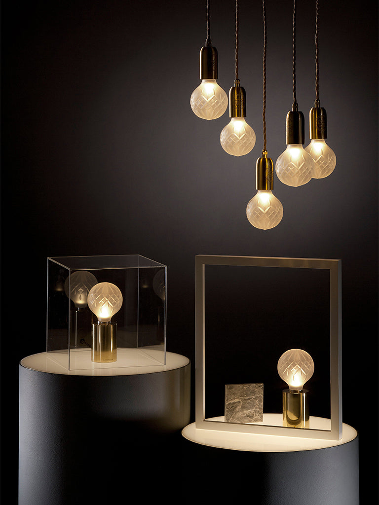 Materials: Lead crystal, brushed brass or polished chrome, steel