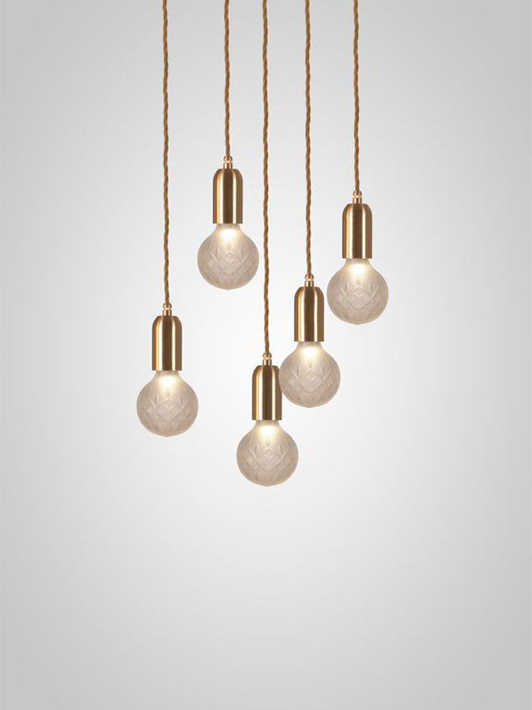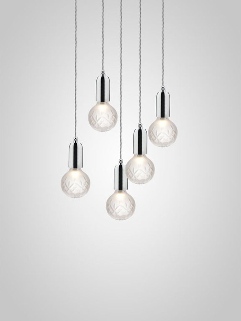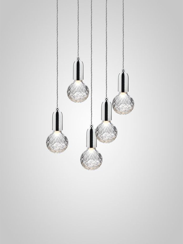 This Crystal Bulb Chandelier features five Clear Crystal Bulbs suspended at set lengths from a satin white ceiling plate and creates a dramatic cluster that is simple to install.