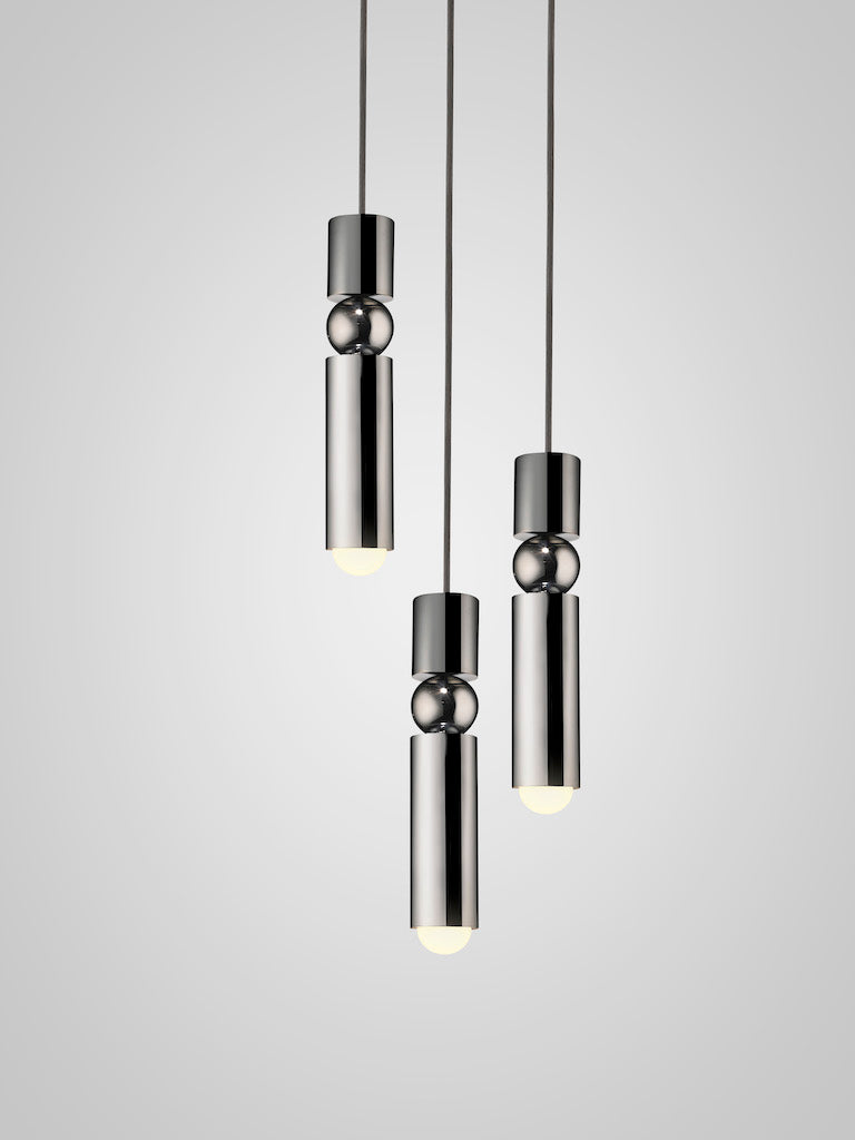 The Fulcrum Chandelier features three Fulcrum Lights suspended at set lengths from a matching finish ceiling plate and creates a dramatic cluster that is simple to install.