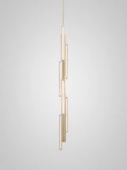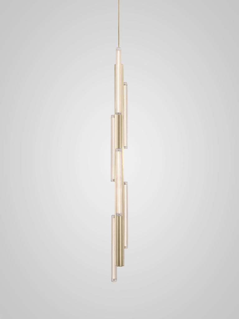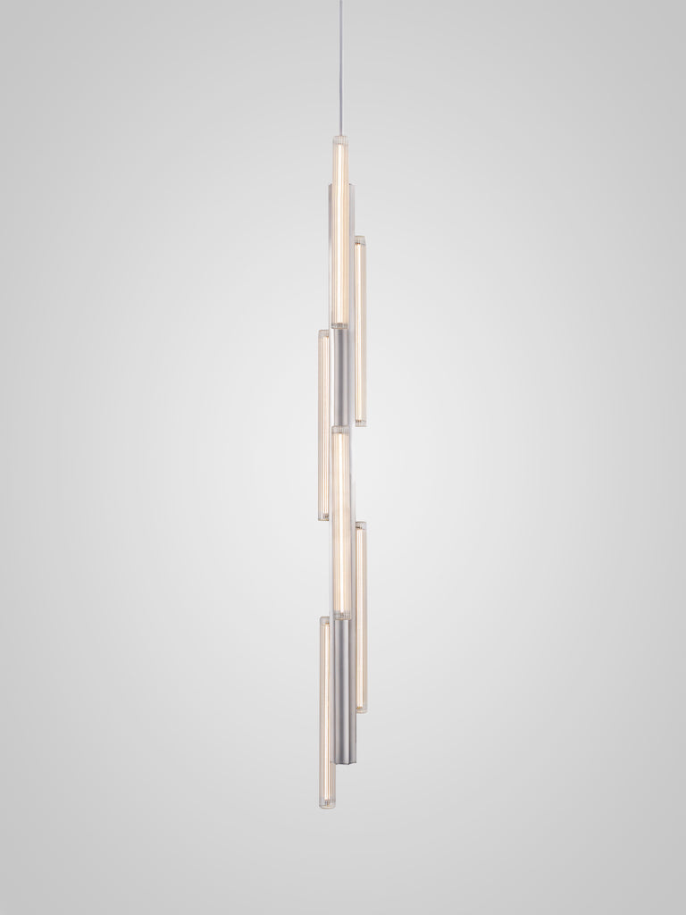 Hail is inspired by the shards of light and shadow often experienced from lancet windows in vast church arches. Available in three options - 3 Short, 3 Tall, 6 Tall - in a gold or silver brushed finish, Hail has an elongated fluted form fabricated in aluminium with asymmetrically positioned reeded glass lightbulbs placed along its structure. The lights can also be connected to create unique longer customisable configurations up to 15 feet / 4 metres in length. Longer options are also possible.
