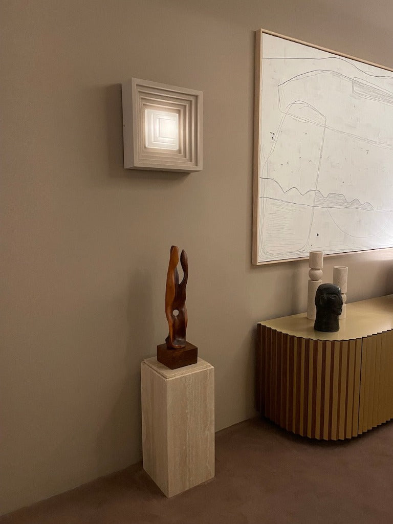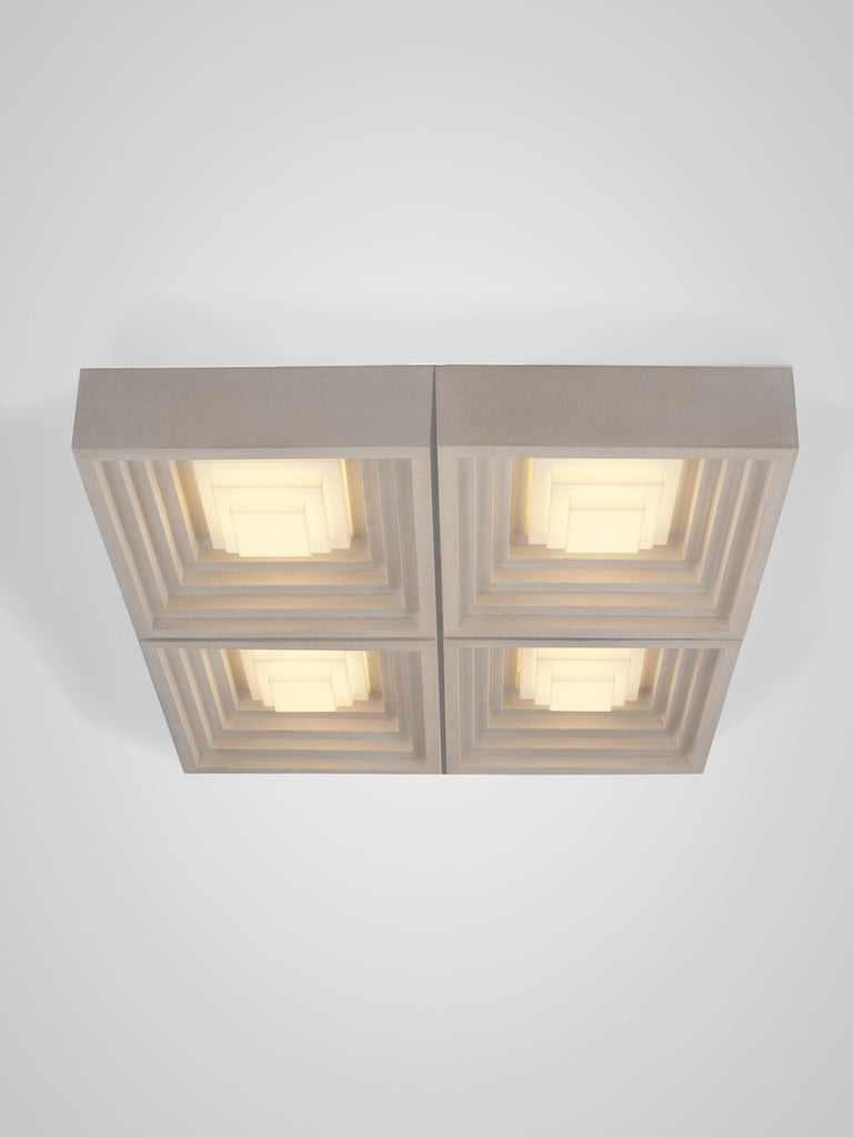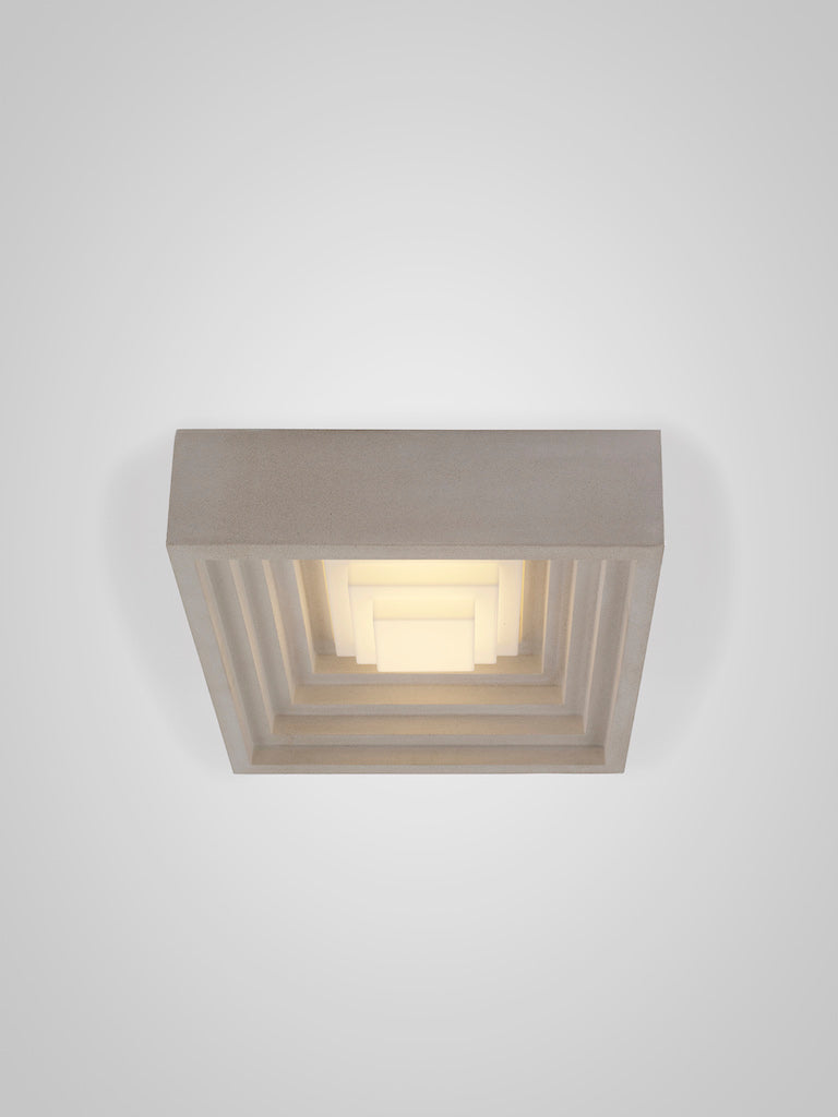 Pantheum is inspired by the distinctive concrete ceiling of Rome’s ancient temple, The Pantheon, as well as the clean lines and geometry of Brutalist architecture. Cast by hand in Jesmonite, its silhouette is a stepped tile-like square that is then sand blasted to give its rough sandstone hewn surface. Pantheum is a surface light, each can be hung on its own or composed in symmetrical clusters to create a ceiling or wall constellation.