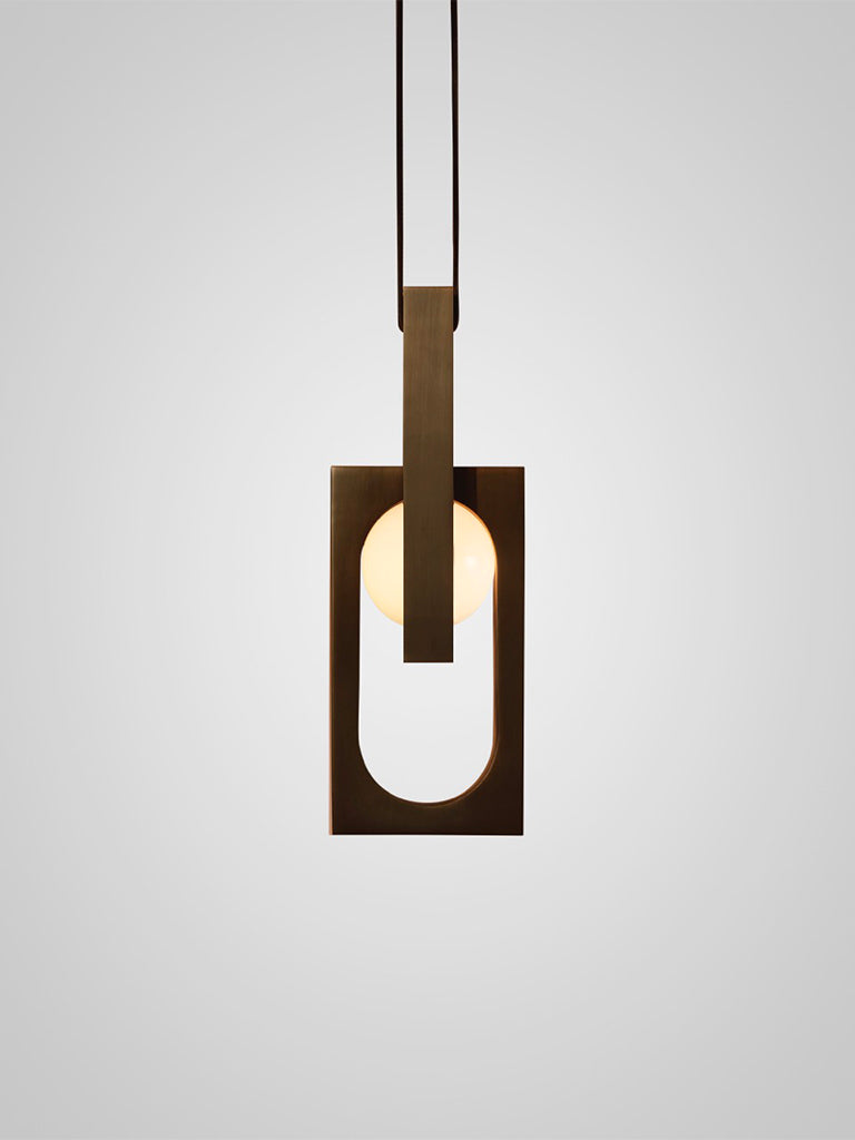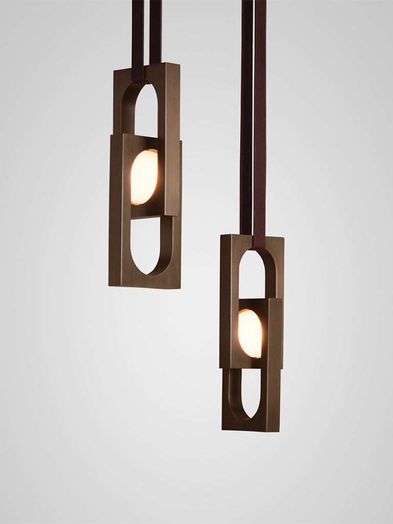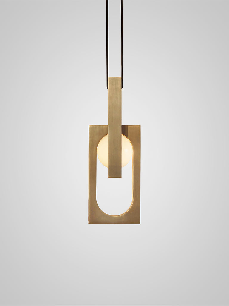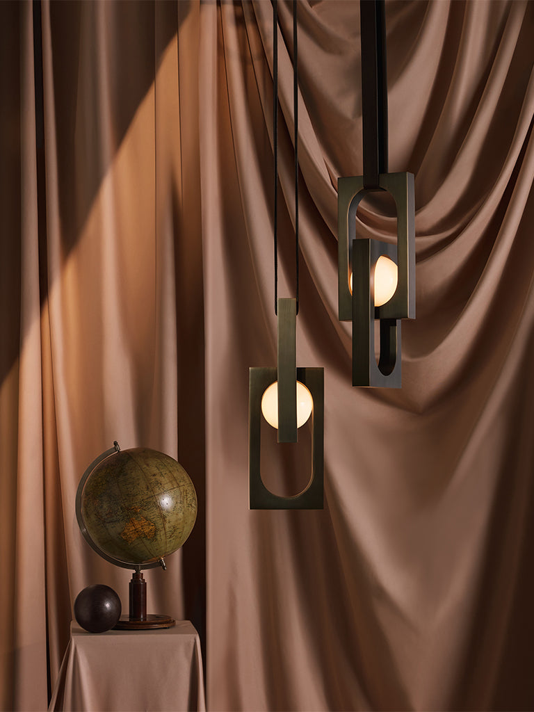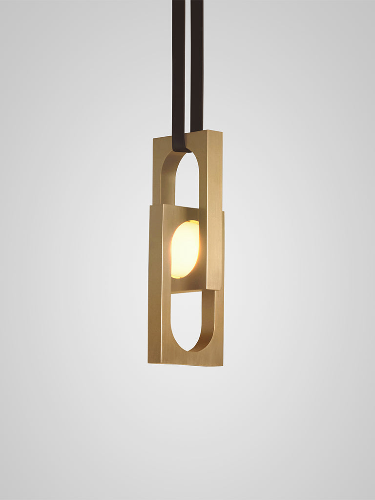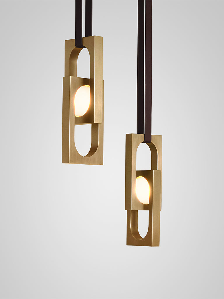 Mythos is a brass pendant light formed of one or two sculptural interconnected links capturing an illuminated glass orb. Mythos Duo is suspended from a hand-stitched leather strap which acts as a sling for the links, concealed connections make it almost impossible to determine how the orb generates its illumination. Mythos is also available as a single pendant suspended by a cord, as a wall light, and as a 3-piece chandelier.